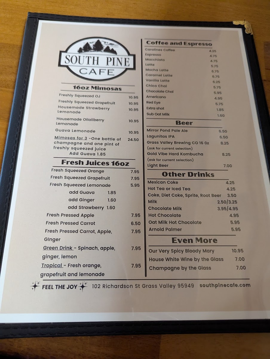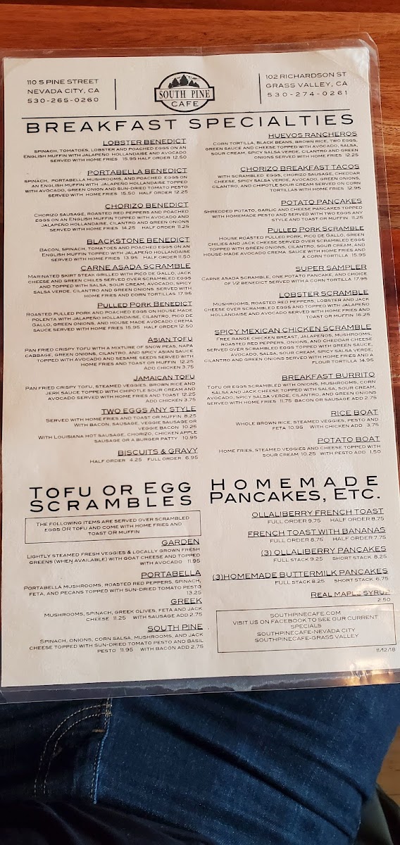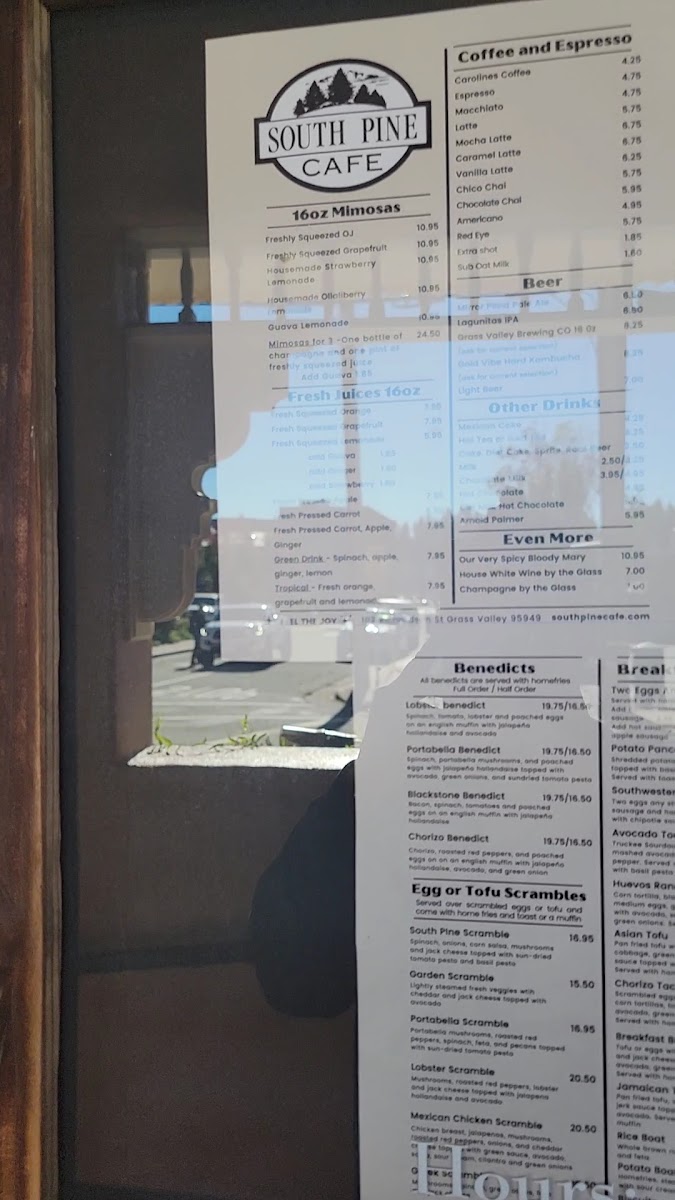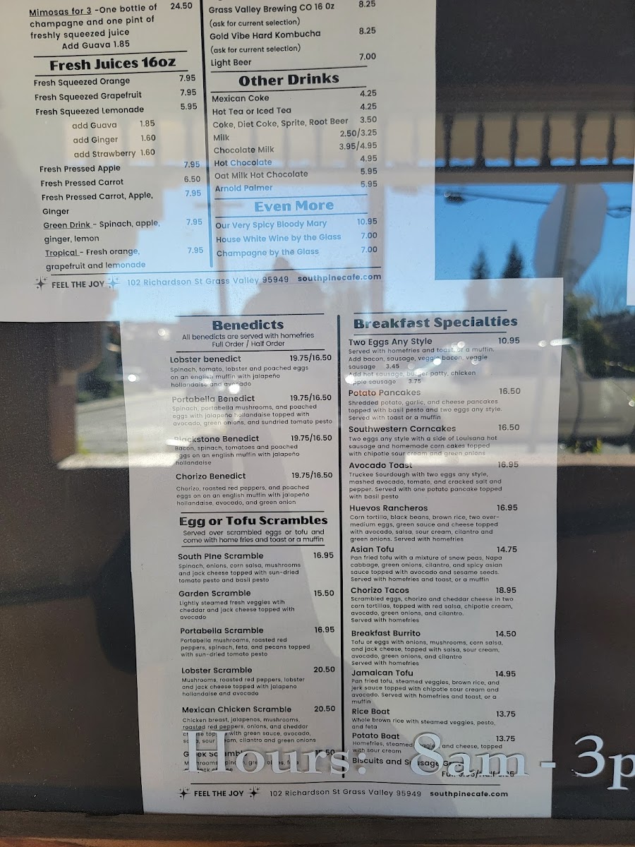 The menu at South Pine Cafe-Grass Valley offers a diverse selection designed to accommodate breakfast, brunch, and lunch preferences. It features a variety of dishes with American roots alongside influences from Mexican, Asian, and vegetarian cuisines. The menu is structured into several key categories for ease of selection.