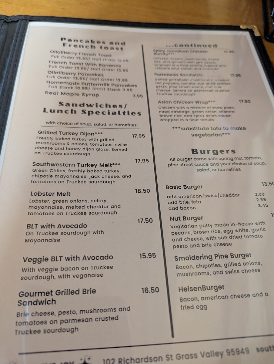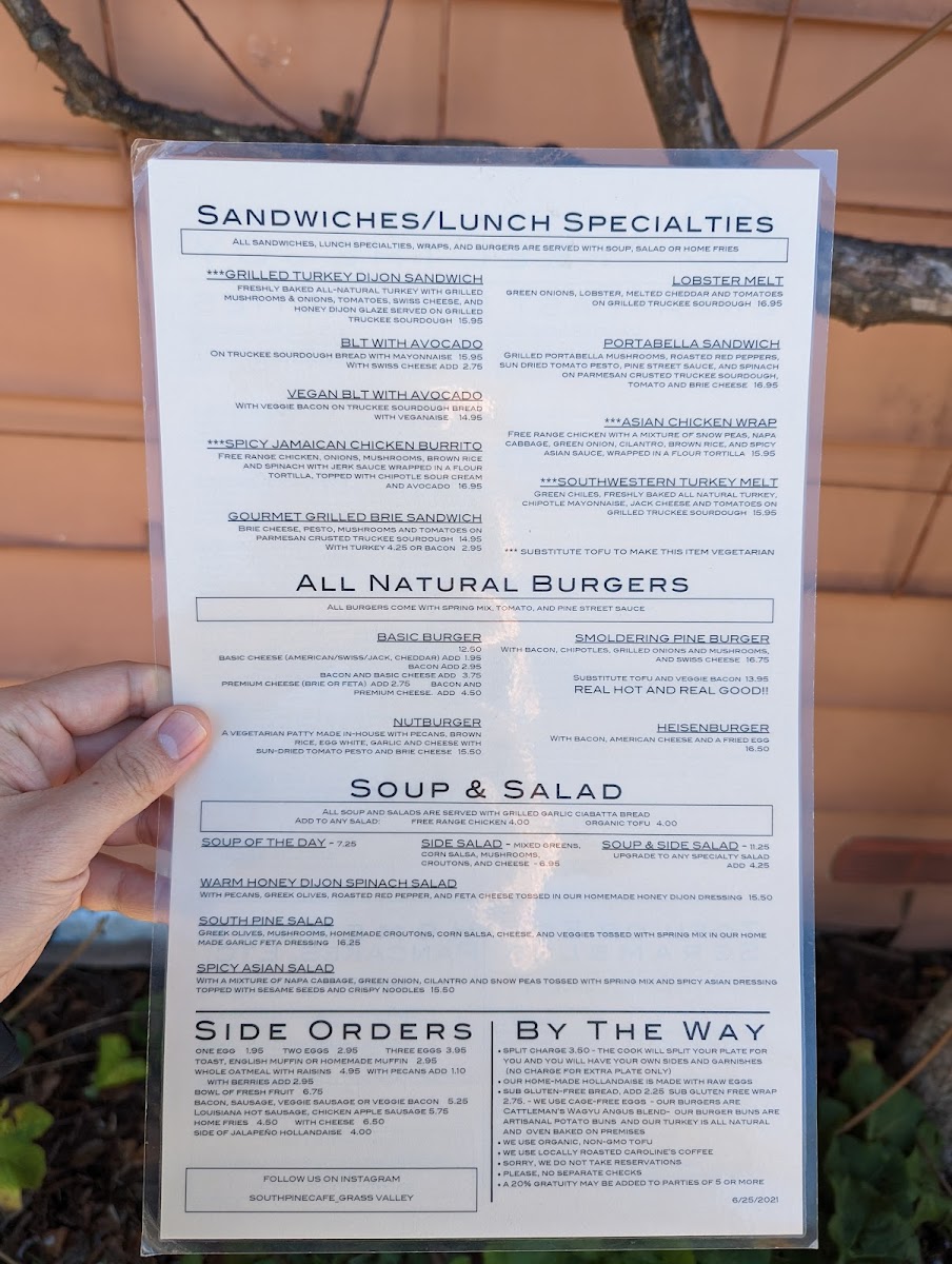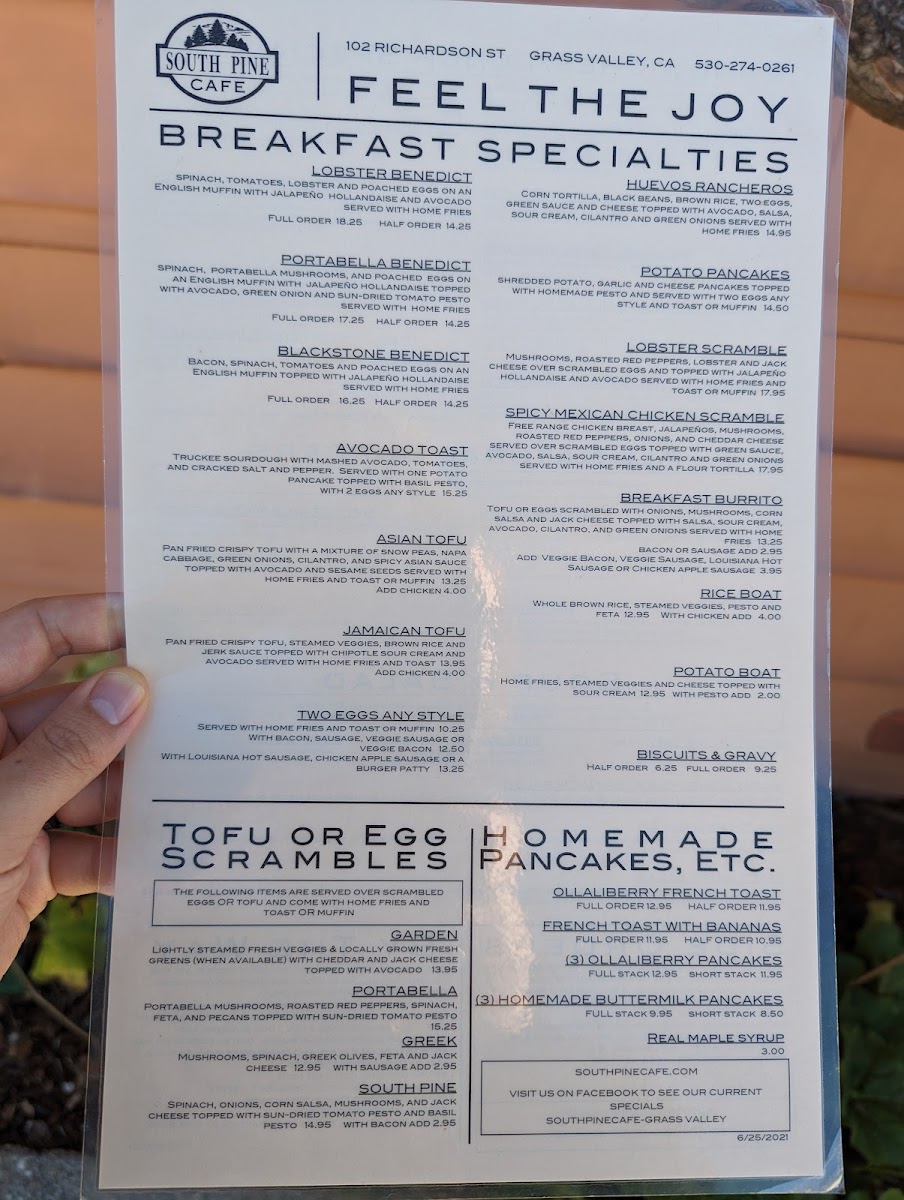 The menu at South Pine Cafe-Grass Valley offers a diverse selection designed to accommodate breakfast, brunch, and lunch preferences. It features a variety of dishes with American roots alongside influences from Mexican, Asian, and vegetarian cuisines. The menu is structured into several key categories for ease of selection.